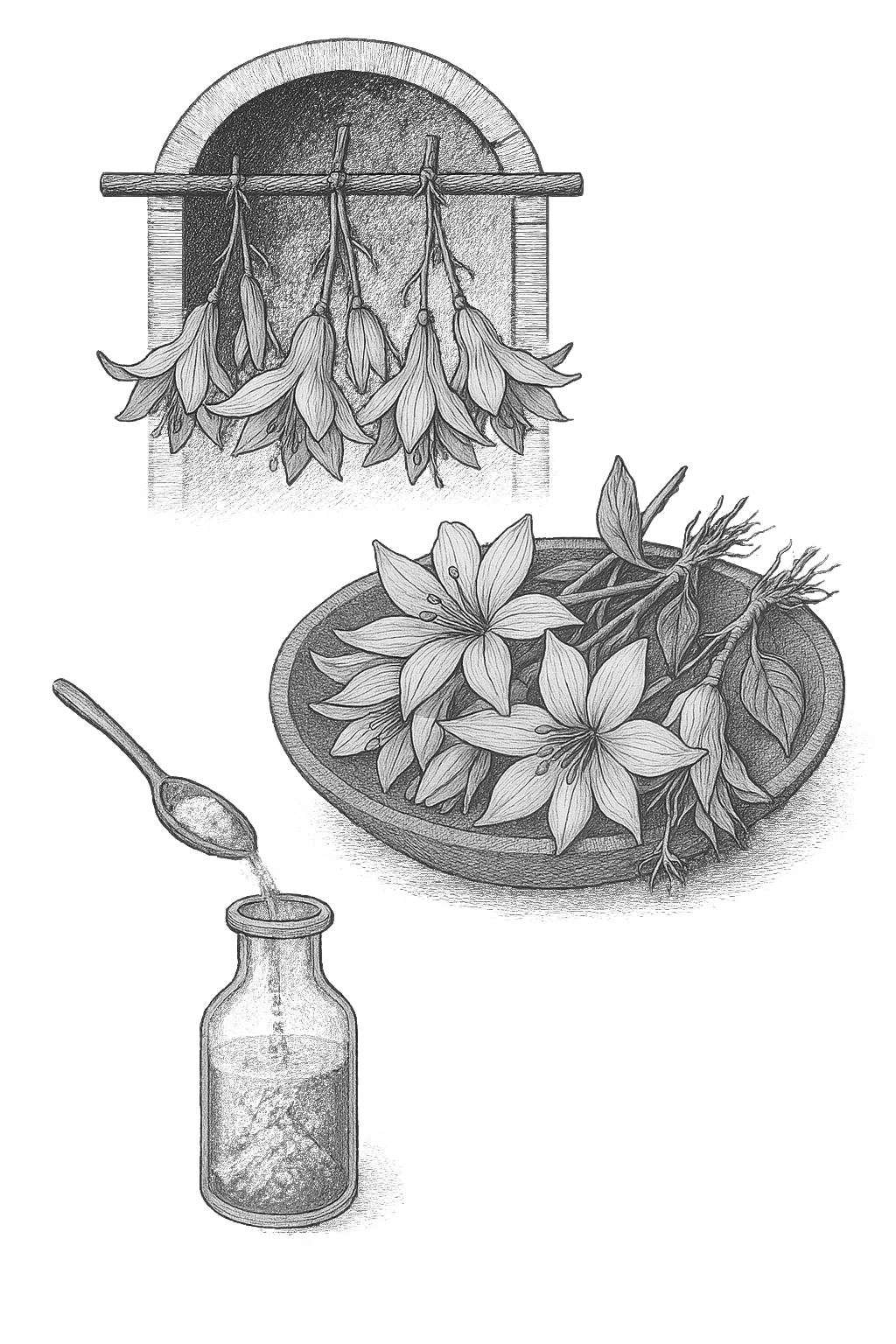 Sklizeň: Květy za úplňku: Nejlepší řez těsně po dosažení vrcholu měsíce; použijte tenkou dýku z Veldovce k odříznutí stonku nad cibulí. Manipulujte spodní částí okvětních lístků, aby nedošlo k rozdrcení světélkujících buněk. Cibulovitá podnož: Ponechte nedotčenou, pokud se nerozšiřujete pěstební záhon.